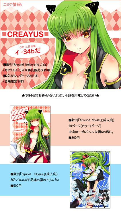 「AROUND NOISE!」 なんと今回はC.C.まで分裂しちゃった?! お子様担当とエロ担当な者同士のてんやわんやなお話です。…と言っても、ほとんどがエロですけどね!今回のC.C.は、いつも以上に顔がエロいヨ!エロの描き方進化したかも!そそられる目がヤバイです(笑) エロ可愛いC様とピュアなC様をご堪能あれ~。あ、今回もカラー口絵が一枚ついてます。今回はページ数少なめなので300円なのですが、そのため完売したら再販はありません(>_<)