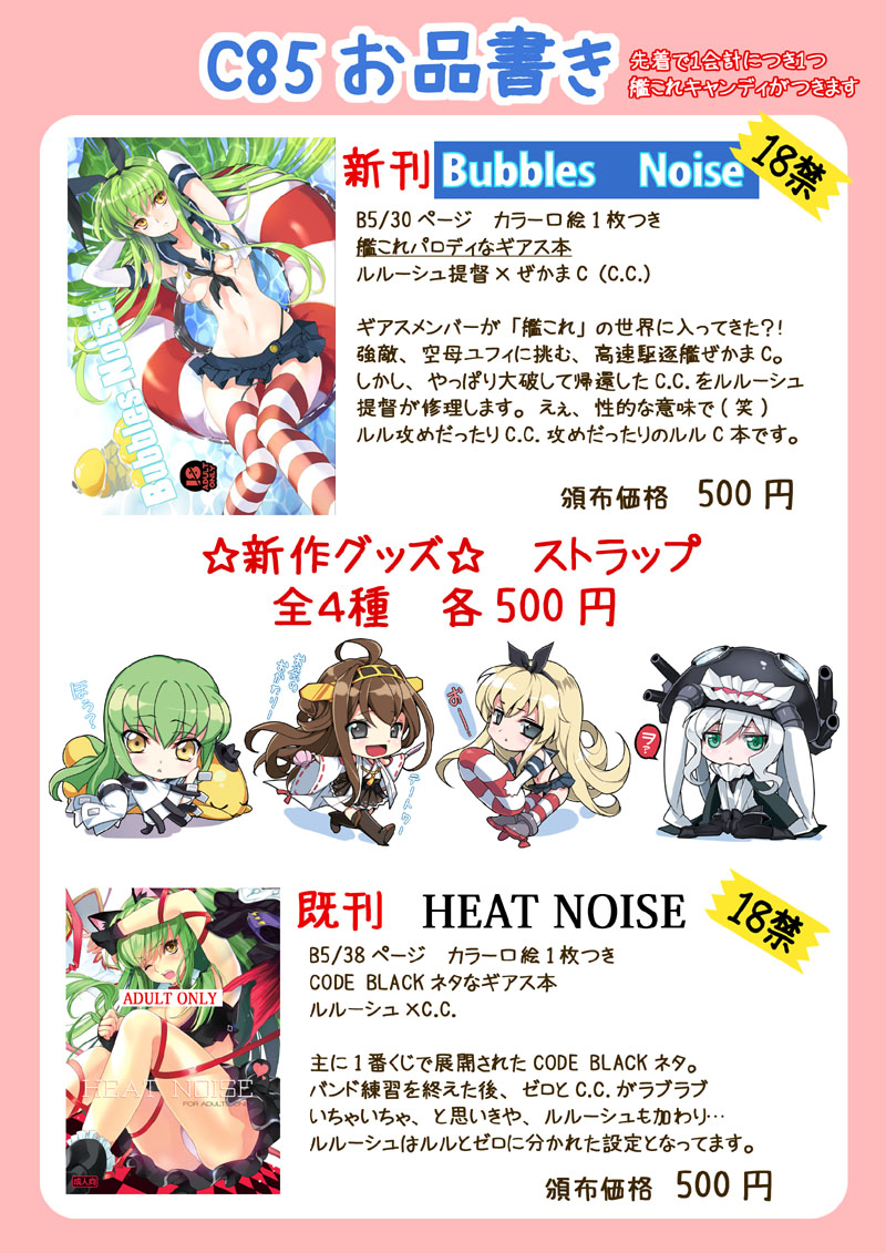 どうです、どうです?新刊の艦これパロディのギアス本、中身が気になりませんか?内容はギャグ3割エロ7割な感じで楽しい漫画になってます☆ぜかまCの突っ走りっぷりに笑いが堪え切れません(笑) あと、ゲストにc様のイラストが入っています。超力作でびっくりします!