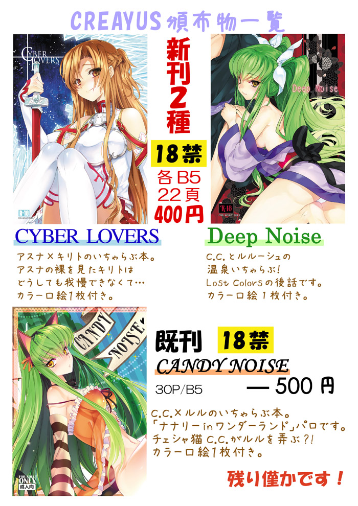 >こちらの情報をたよりに、コミケ終了近くにすべりこみましたが、買えてよかったです。C.C.が綺麗に可愛く描かれて、購入出来て嬉しいです。